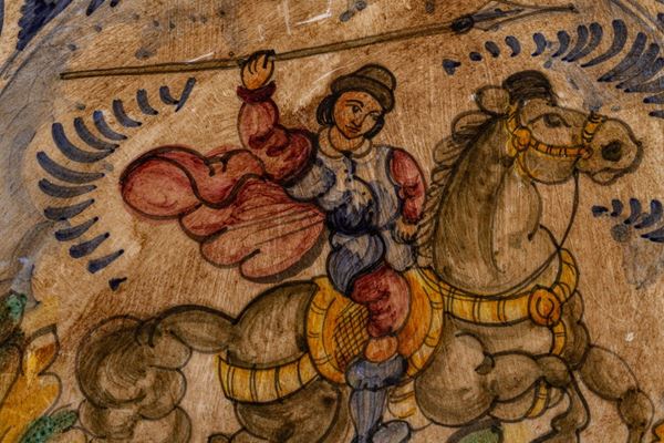 in ceramica su fondo avorio. Al centro cavaliere con lancia.