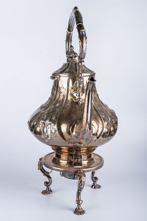 in metallo argentato, completo di fornello, con parti incise e a rilievo di forma barocca. Base d'appoggio e 3 gambe a virgola, distacco alla cerniera del coperchio.