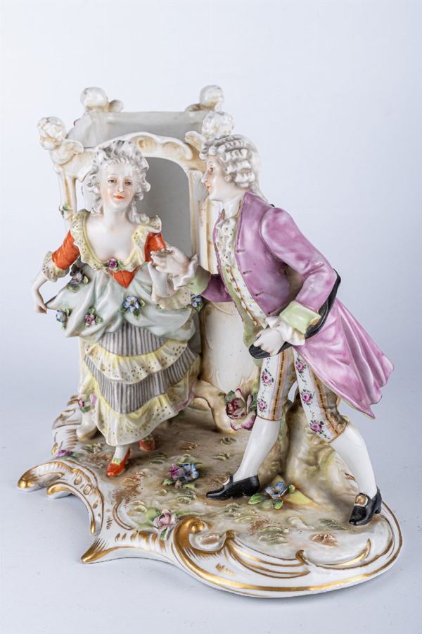 Scultura in volume in porcellana policroma. Coppia di personaggi con portantina, in abbigliamento settecentesco su base Rocaille.
