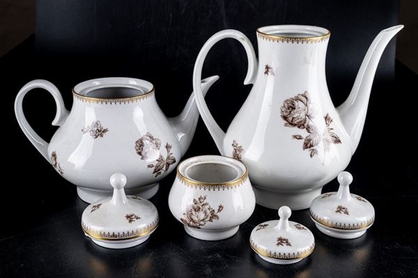 in porcellana bianca con decoro floreale e finiture in oro zecchino. Composto da 54 pezzi.