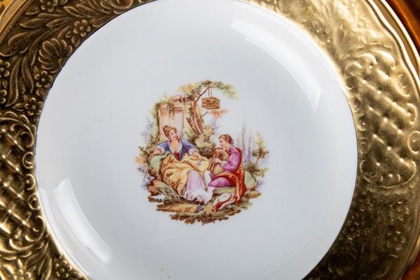 in porcellana bianca, con decoro floreale e scene galanti, bordatura in oro zecchino. Composto da: 12 piatti fondi, 34 piatti piani, 12 piatti da frutta, 2 piatti da portata per pesce, 2 piatti fondi da portata, 1 zuppiera, 2 piatti piani da portata, 1 salsiera, 12 piattini per pane, 12 piattini da the, 11 tazze da the, 13 piattini da caffè, 12 tazzine da caffè, 1 teiera, 1 caffettiera, 2 zuccheriere, 2 lattiere, 1 piattino lungo da aperitivo, 2 piattini fondi da aperitivo. Pezzi totali: 135.