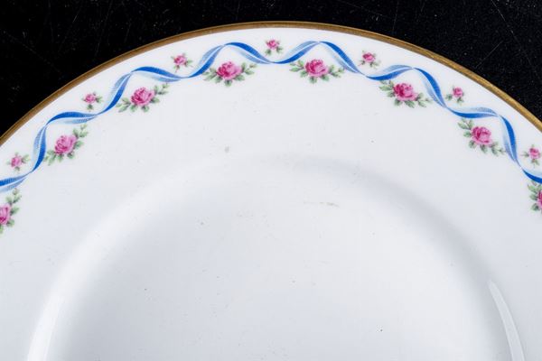 profilato in oro zecchino, con decoro a nastro e roselline, composto da 18 scodelle piane, 6 scodelle fonde, 6 piattini, 7 piatti da portata. Pezzi totali: 37