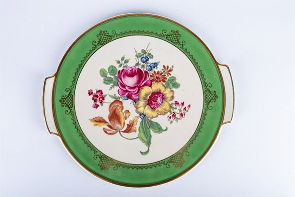 In porcellana policroma, con decoro floreale su riserva bianca bordata d’oro, anse a gradino