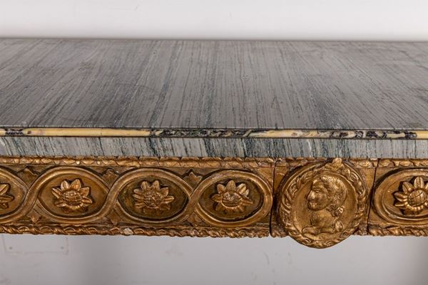 in legno dorato a 6 gambe rastremate verso il basso, con decori a fiori e a palmette a rilievo, parte centrale a gettante con fascia marca piano motivi vegetali scolpiti. Piano in marmo in marmo grigio bardiglio con cornice sull'orlo in rilievo stondata. Due cassetti nella parte centrale del corpo sotto il piano. Cadute della doratura in più punti.
