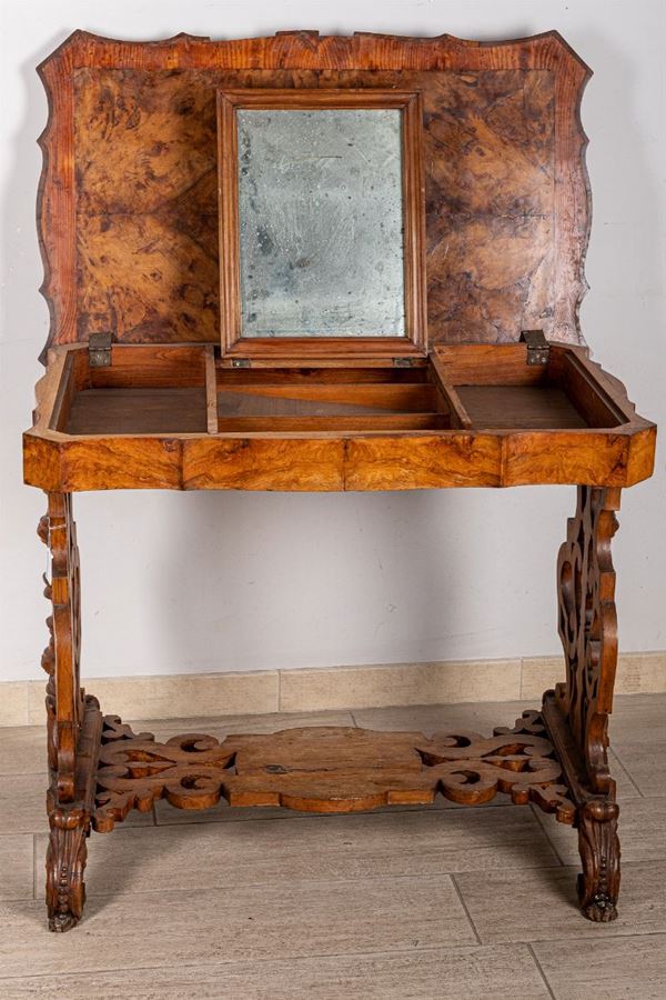 in noce e radica di noce, a bordo mistilineo, gambe a lira traforate raccordate da fascia orizzontale alla base, piano a compasso con all'interno specchio e cassettini.