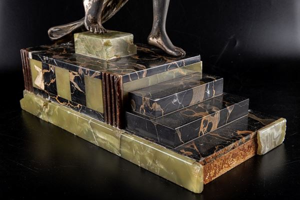 scultura in volume, in metallo argentato, con base in marmi policromi.  Firmata "Uriano" sulla veste della figura femminile.