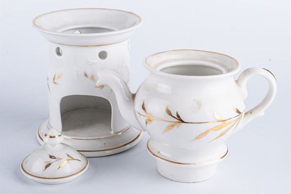 A due corpi, in porcellana bianca, con decoro a fronde in oro zecchino. Reca dicitura “Buonanotte”