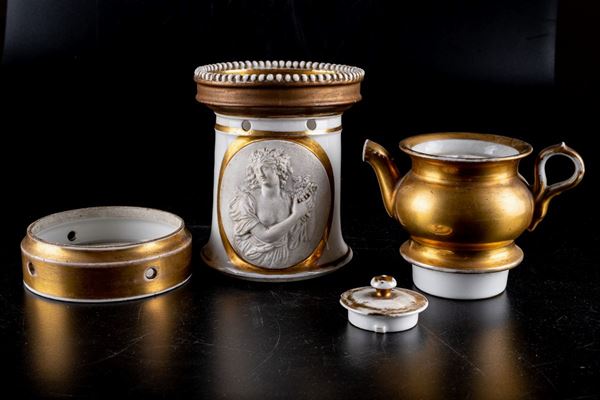 in porcellana bianca, con decoro in oro zecchino e corpo del cilindro con forma muliere in rilievo. Collo del cilindro restaurato, piccole sbeccature.