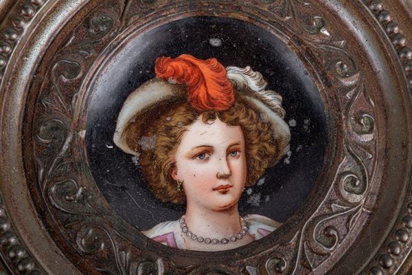 in porcellana, entro piattino convesso montato entro raggiera in bronzo a rilievo. Lievi danni alla raggiera.