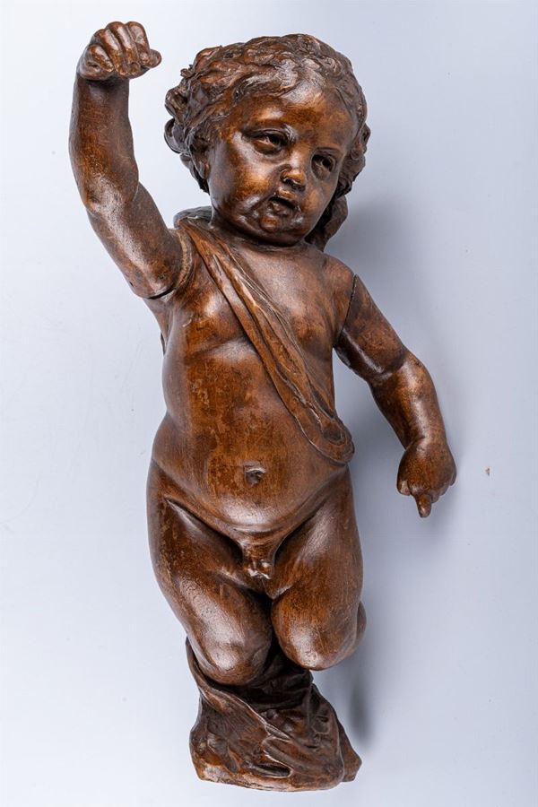 Scultura in volume in legno a patina bruna. Di gusto Barocco.