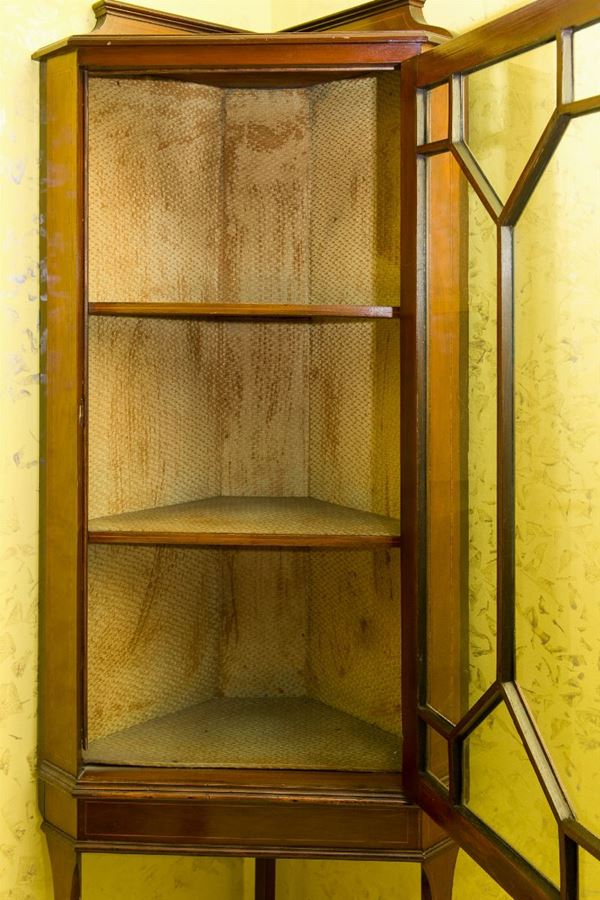 in mogano, ad uno sportello in vetro, con riquadrature in legno, a 3 gambe raccordate alla base da un piano. Filettature in legno di frutto su fronte e fianchi. L'oggetto è visionabile solo in foto e dovrà essere ritirato direttamente dalla casa del proprietario, previo appuntamento (Roma)