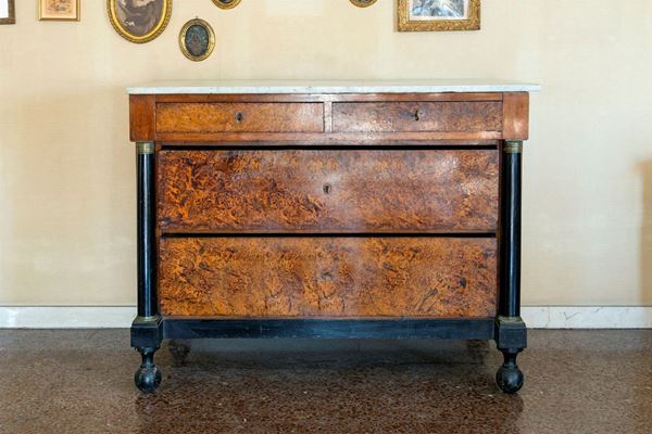 a 4 cassetti, piano in marmo bianco, piede a palla con colonne in legno ebanizzato, con impiallacciatura in legno di Tullia e finiture in bronzo. Felature all'impiallacciatura sui fianchi. L'oggetto è visionabile solo in foto e dovrà essere ritirato direttamente dalla casa del proprietario, previo appuntamento (Roma)