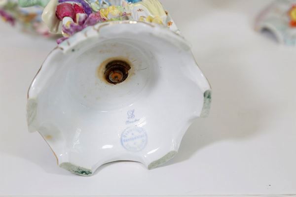 in porcellana policroma, con personaggi e decori floreali a rilievo e dipinti entro finiture in oro zecchino. Vasca quadrilobata sopraelevata su alto stelo, poggiante su base Rocaille.