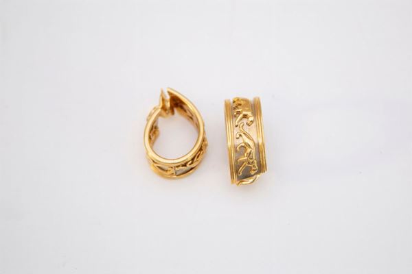 in oro 750/1000 a due colori, modello a clip, manifattura Cartier in scatola originale. Peso: 44 gr