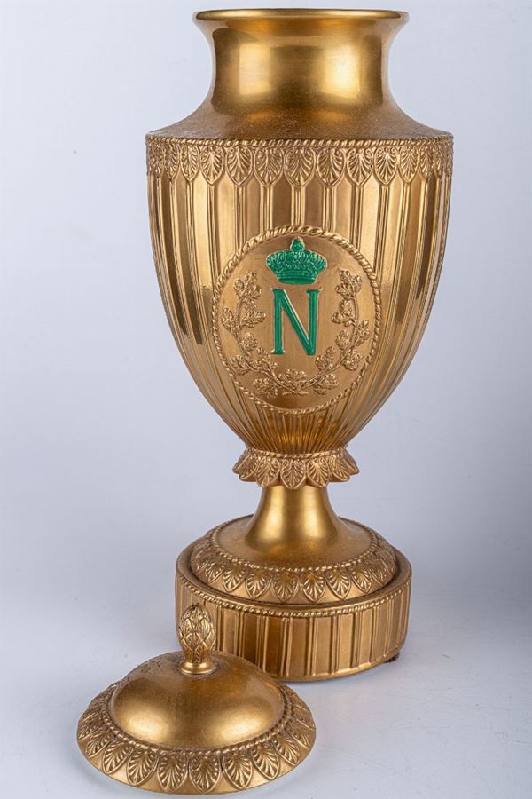 In porcellana dorata, con corpo del vaso a coppa, coperchio con pomolo, con al centro nel corpo del vaso, entro riserva perlinata, “N” coronata. Marchiato “Agostinelli” alla base