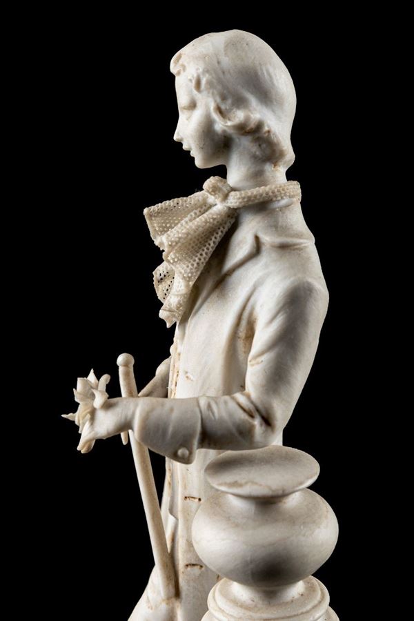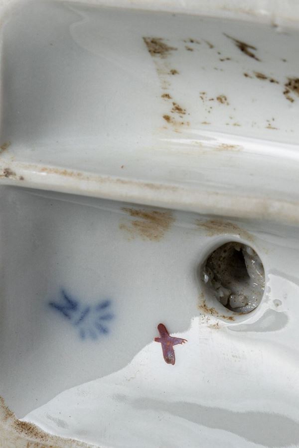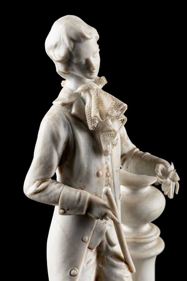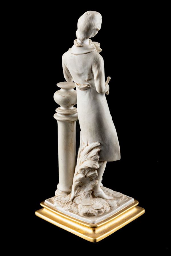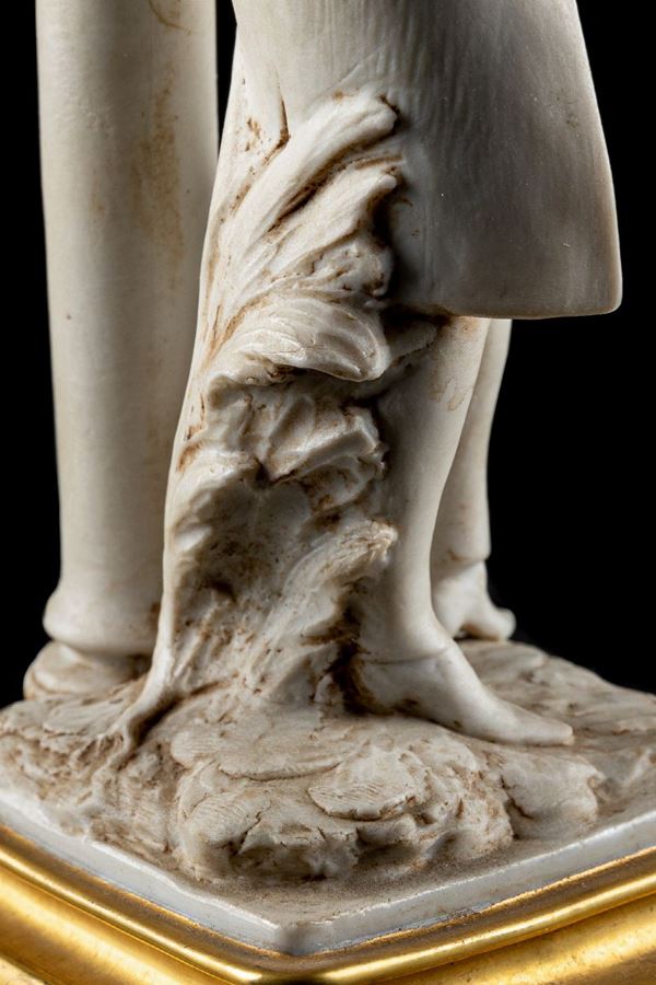 scultura in volume in porcellana bianca, su base quadrangolare con finiture in oro zecchino. Marcata alla base "N" coronata in blu sottosmalto.