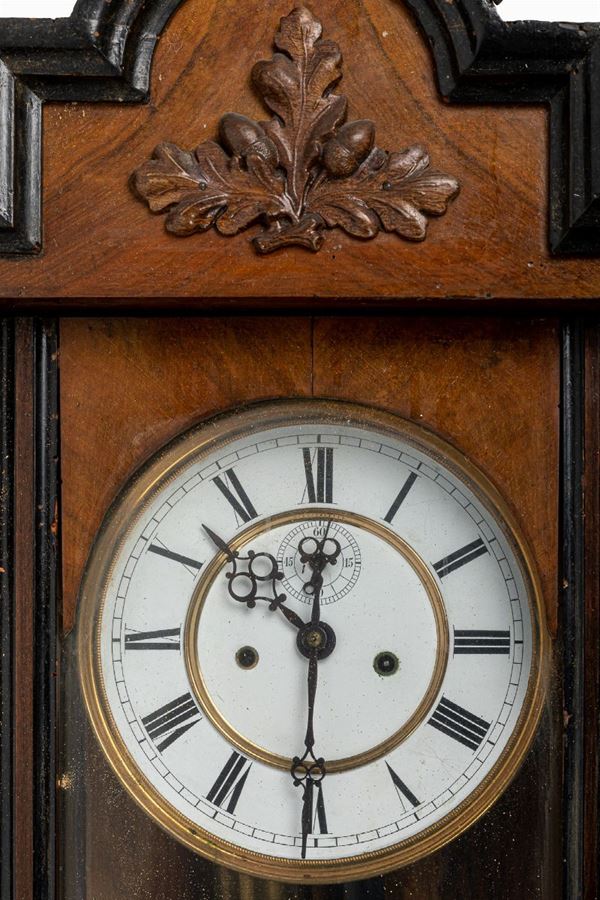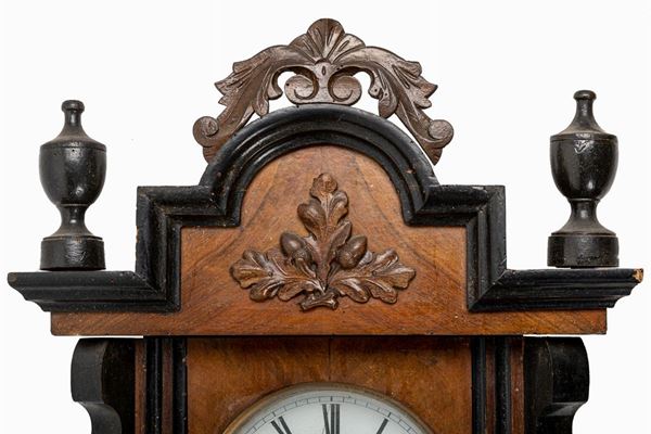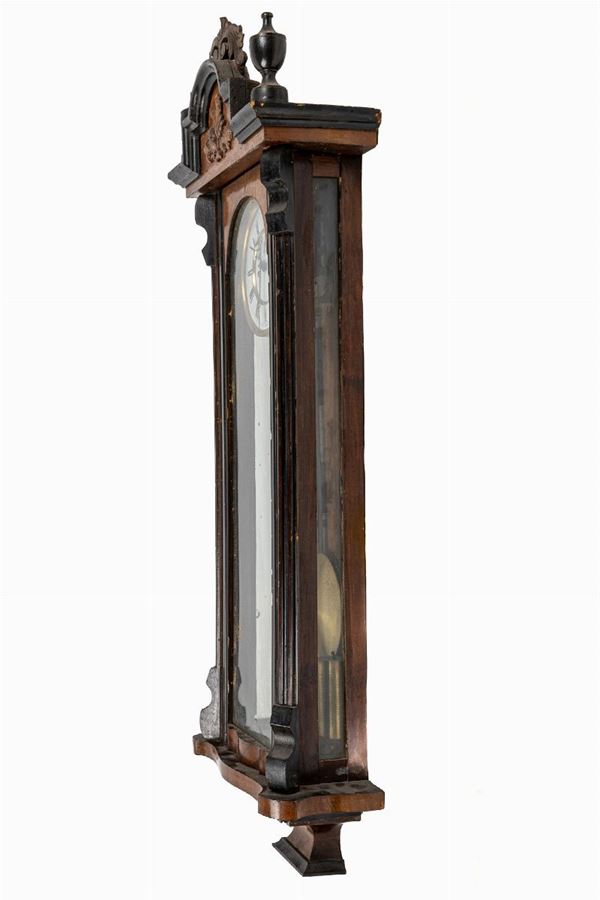 da parete, quadrante a numeri romani su fondo bianco, con caricamento delle ore e delle suonerie. Scatola in legno ebanizzato in nero e radica di noce.