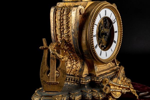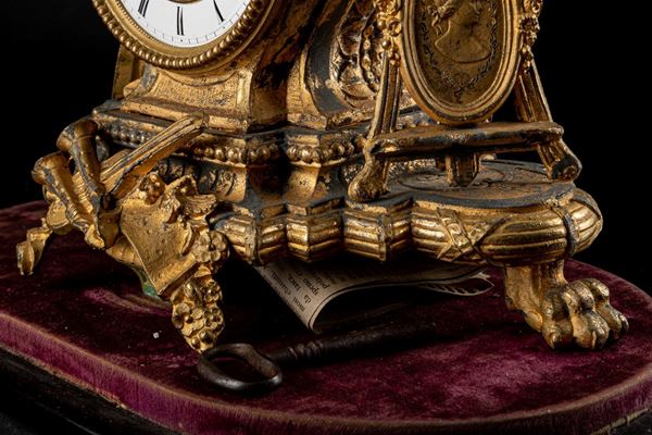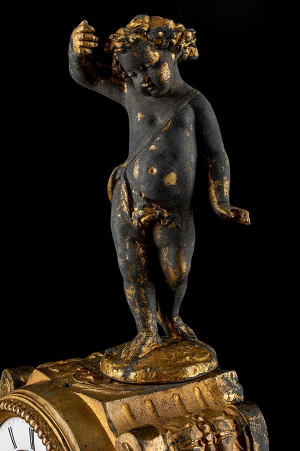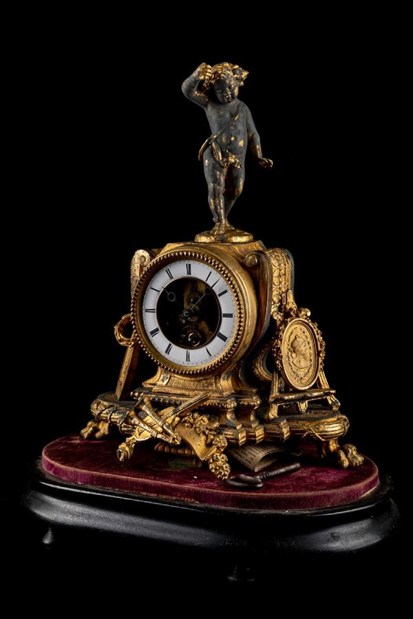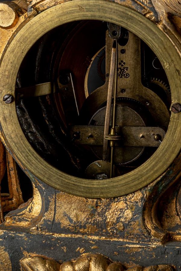 in antimonio dorato, meccanismo a pendolo, entro campana di vetro. Parte rotta, parte ossidata. Quadrante a numeri romani.