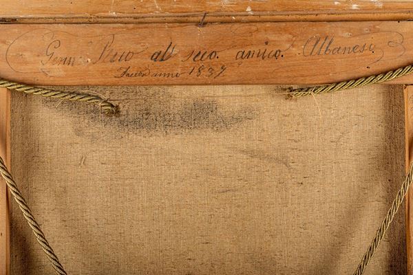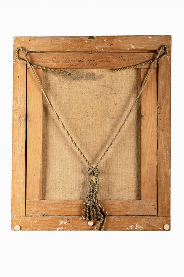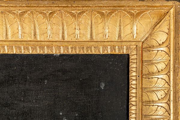 In cornice coeva in legno dorato e scolpito a palmette. Diverse cadute della doratura