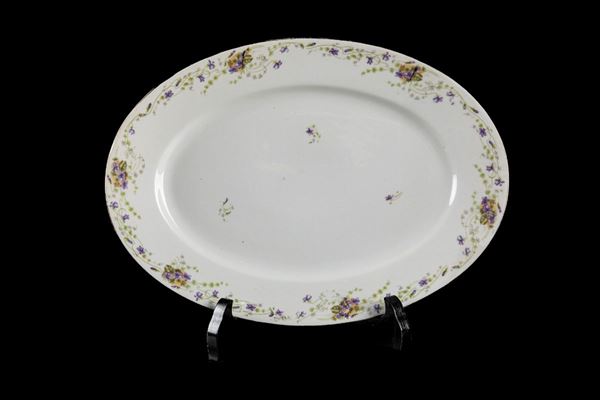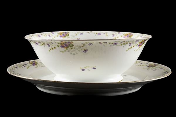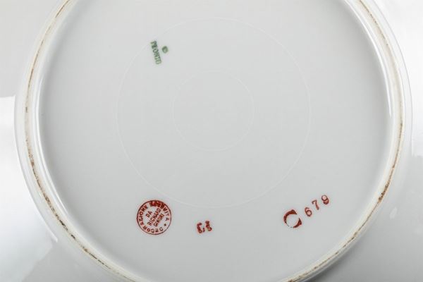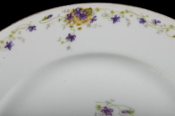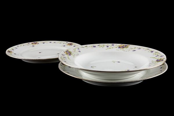 in porcellana bianca a decoro floreale policromo, composto da: 33 piatti piani, 11 piatti fondi, 11 piattini, 1 zuppiera, 2 vassoi tondi e 4 vassoi ovali. Totale pezzi: 62.