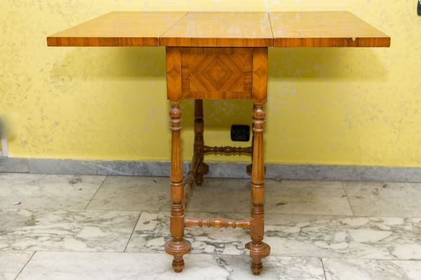 in piuma di mogano, con 4 gambe al tornio, raccordate alla base. Parti rigate e mancanti. L'oggetto è visionabile solo in foto e dovrà essere ritirato direttamente dalla casa del proprietario, previo appuntamento (Roma)