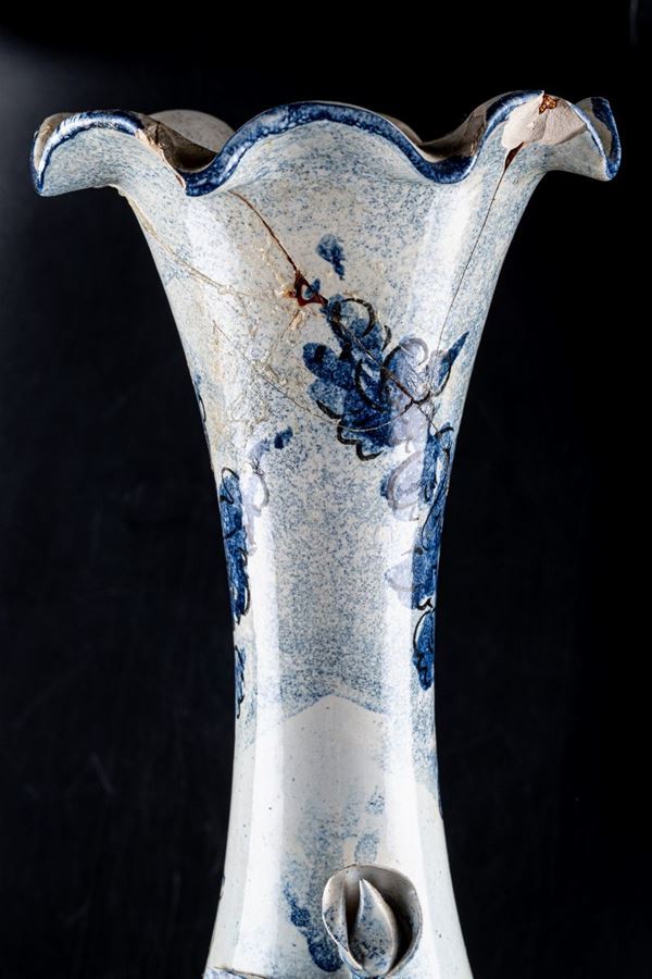 bianca, con decoro floreale blu, con fiori in rilievo, orlo ad onda. Firmato sotto la base e sulla pancia. Restauro al collo
