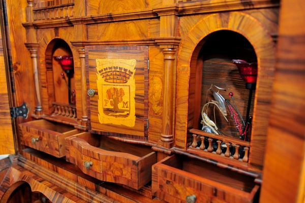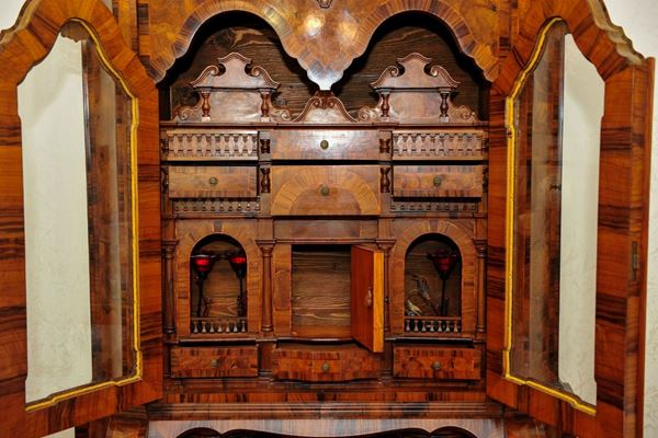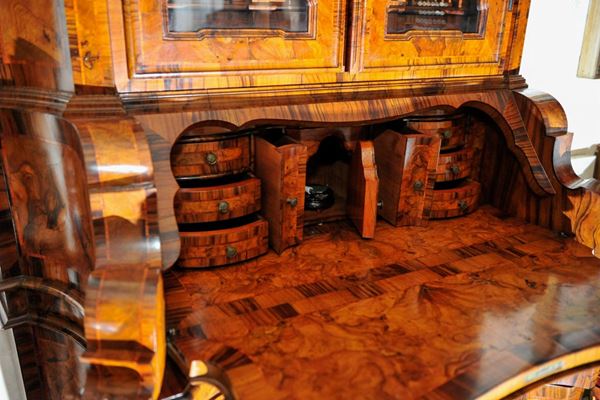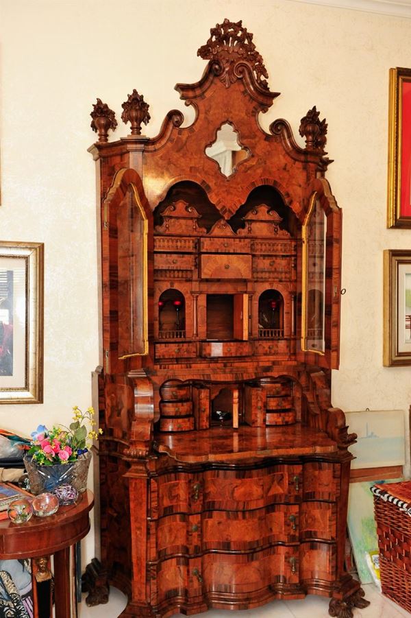 a tre cassetti, con ribalta ed alzata a fronte mossa, fianchi mistilinei, in radica di noce, con filettature in legno di frutto, quattro piedi di appoggio a doppio riccio con volute, alzate a due sportelli, con teste scolpite e cimasa a festone con vasi ad ornamenti floreali, interno con architettura a cassettini e scomparti. L'oggetto è visionabile solo in foto e dovrà essere ritirato direttamente dalla casa del proprietario, previo appuntamento (Roma)
