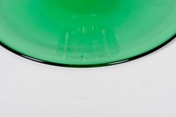 in vetro soffiato con calice aperto. Corpo a pigna e base circolare, in cromia giallo citrino e verde, con puleghe in oro.