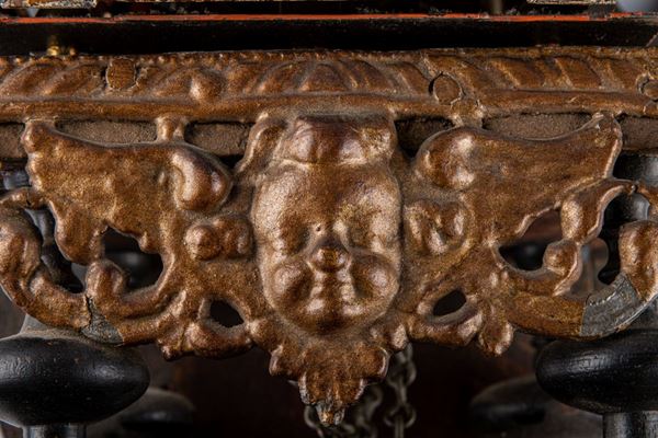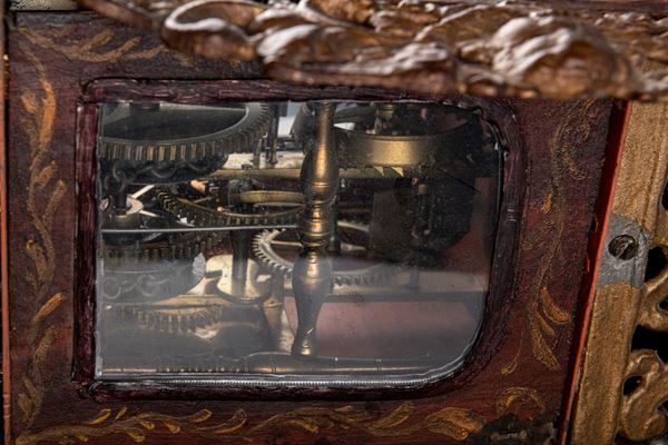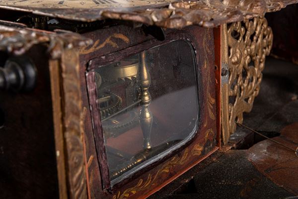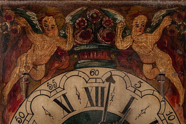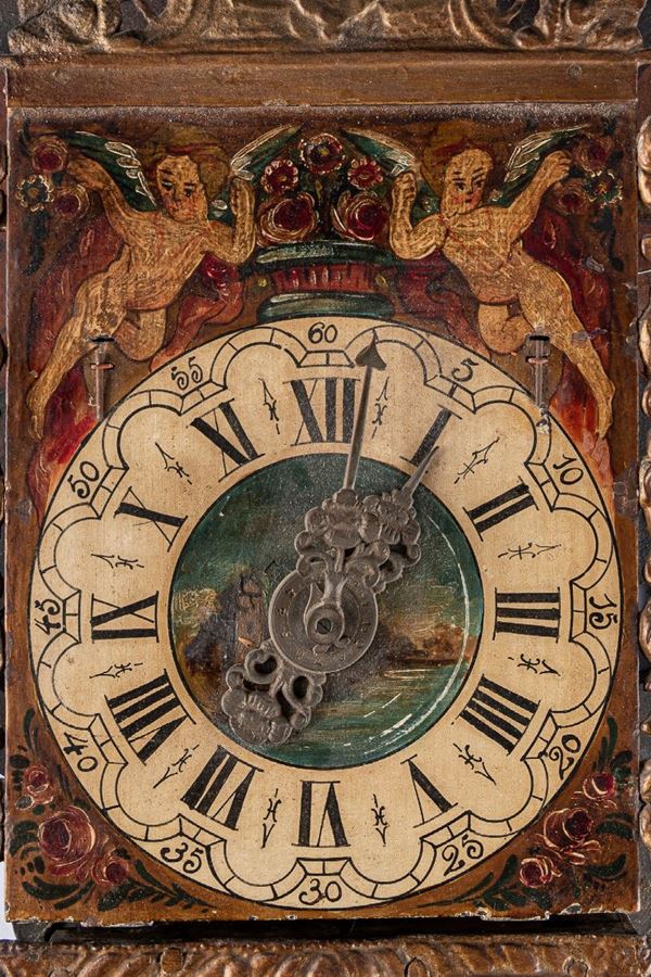in legno laccato e dipinto a figure femminili, movimento a pendolo con base e baldacchino in legno e decori a rilievo in fusione dorata, quadrante in metallo dipinto con numeri romani. Totale pezzi: 3