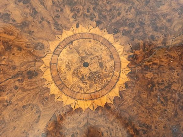 di linea tonda, con piano in radica di ulivo con filettature e tarsie; gamba a boccia, piede a ciabatta a 3 punte.