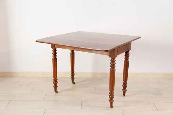 in mogano, 4 gambe al tornio con rotelle e 2 bandelle laterali. Presenza di 2 cassetti nella fascia del piano.