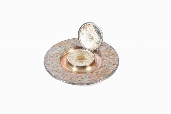 Ad una boccia, in metallo argentato e vetro. Parti incise e a rilievo. Manifattura Helkington. Argentatura usurata.