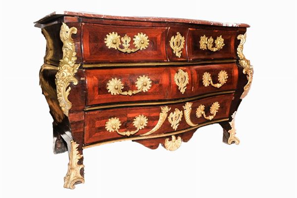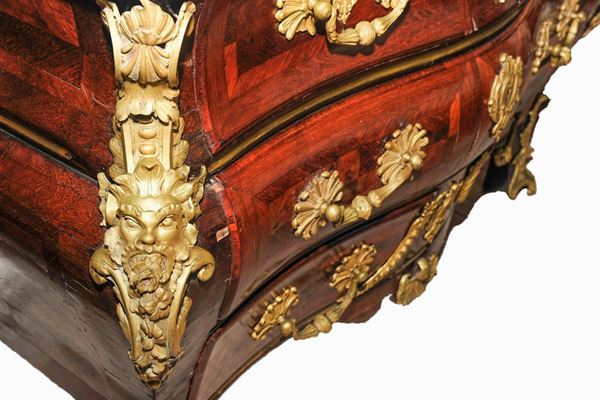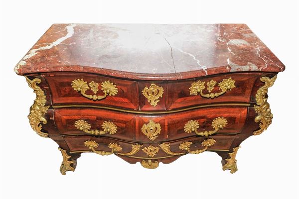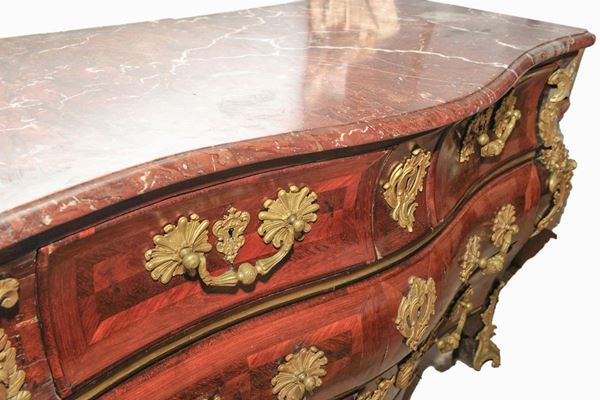 a 4 cassetti, in ebano viola e palissandro, con applicazioni in bronzo. Piano in marmo rosso di Francia. Stampigliatura MONDON. Piano in marmo spaccato in due parti.