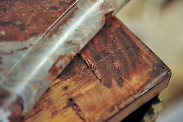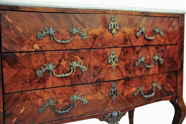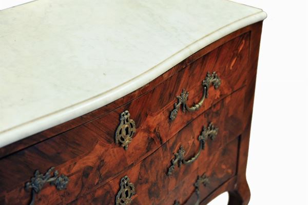 a 3 cassetti, in radica di noce, guarnizioni in bronzo, piano in marmo bianco. Piccole mancanze.