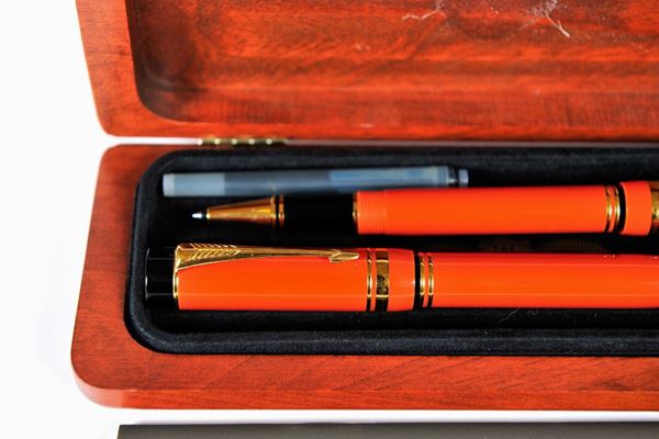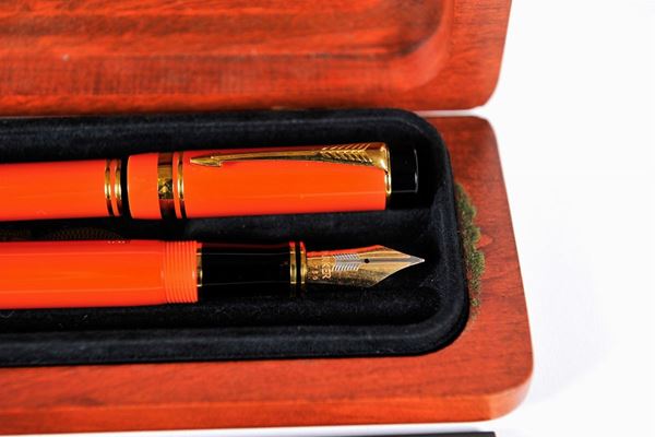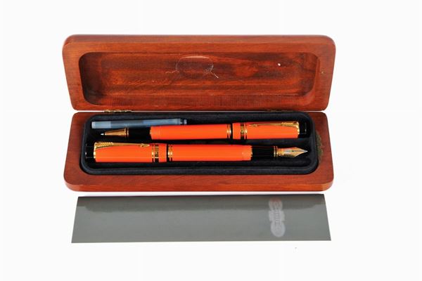 composta da una penna stilografica, con pennino di misura F, e una penna ad inchiostro. Entrambe entro custodia originale in legno. Complete di scatola, certificato di autenticità e cartuccia di inchiostro.
