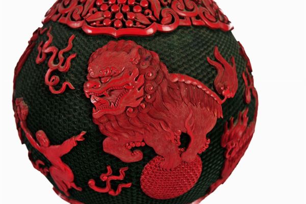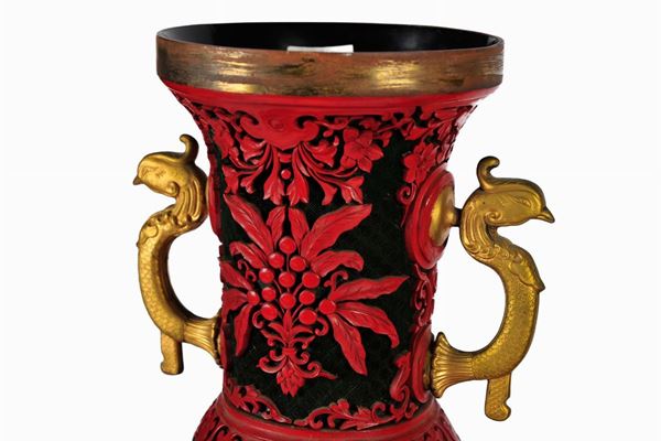 In lacca rossa su fondo nero, corpo globulare con collo alto strombato e base svasata verso il basso. Decorato in lacca rossa a rilievo con scene di genere. Impugnatura a uccelli stilizzati. Con base in legno ebanizzato.