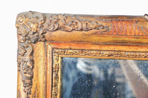 in legno intagliato e dorato, con finiture a stucco, di forma rettangolare. Doratura usurata in più punti e marezzature sparse sullo specchio.