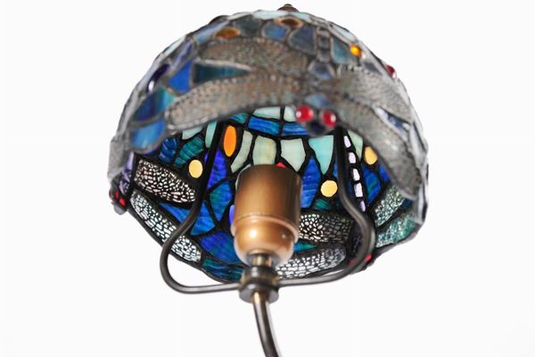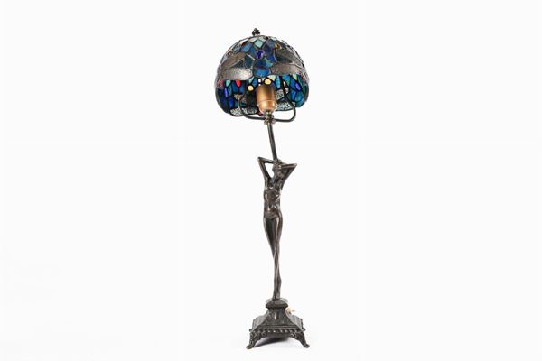 in bronzo, con ventola a vetri piombati colorati, corpo con profilo muliebre con base quadrangolare.