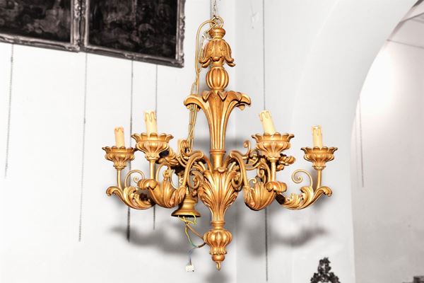 In legno dorato e intagliato a volute vegetali. Parti in ferro.