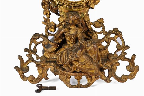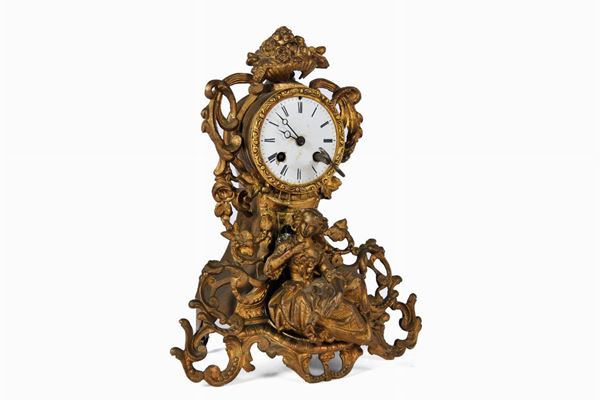 in metallo dorato, di forma barocca con damina sul fronte, quadrante a smalto bianco con numeri romani. Orologio con meccanismo a pendolo.