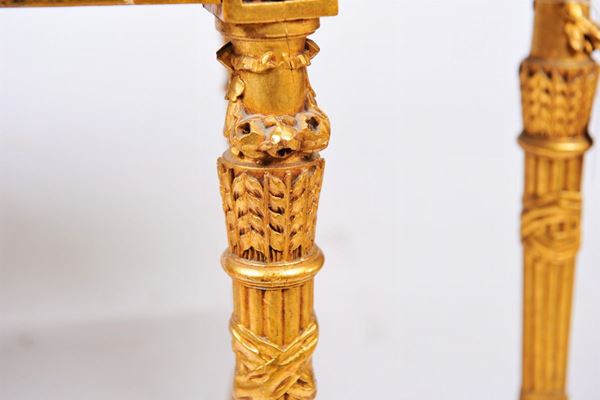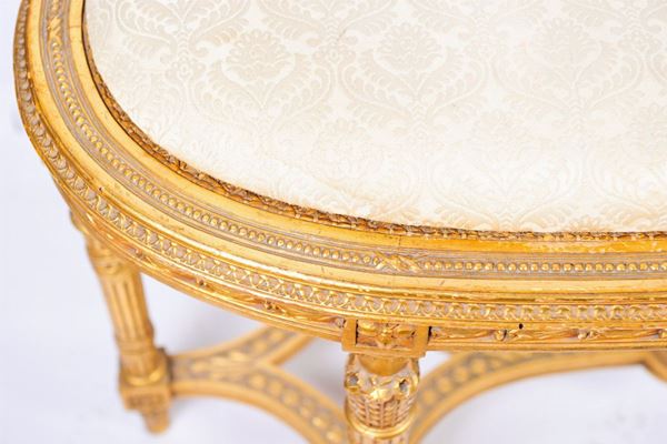 In legno dorato, di forma ellittica, 6 gambe a tronco di cono scolpito a fascio, con piano a canneté, rifinita con decori floreali a rilievo. Cuscino in broccato bianco.