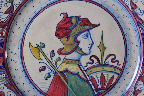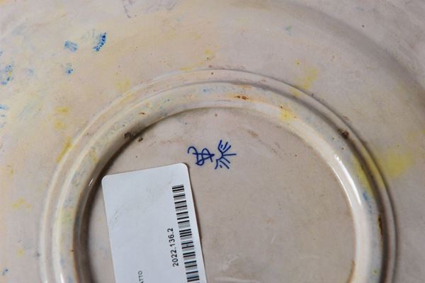 in ceramica a lustro, con profilo virile nel cavo e tesa con decoro floreale entro riserve bianche e blu. Manifattura Alfredo Santarelli