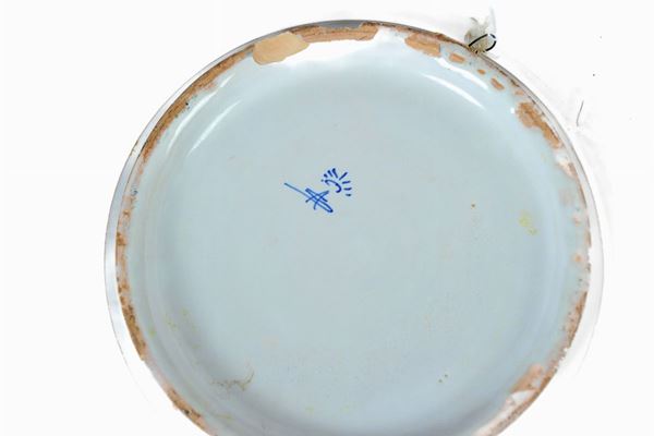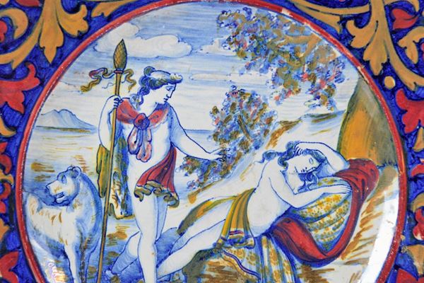 a lustro, con scena mitologica nel cavo e girali in foglie, frutti e animali di invenzione nella tesa. Manifattura Alfredo Santarelli Gualdo Tadino.