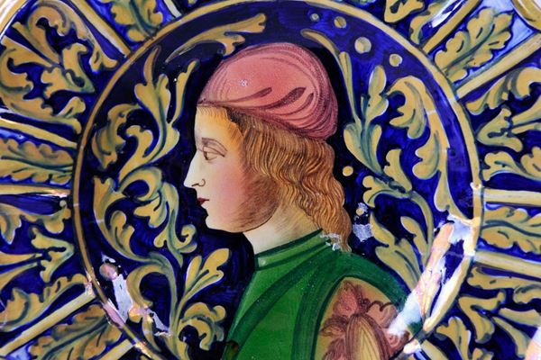 a riflesso, con personaggio virile nell'incavo e decoro a fiori stilizzati nella tesa. Bordo a 8 punte.