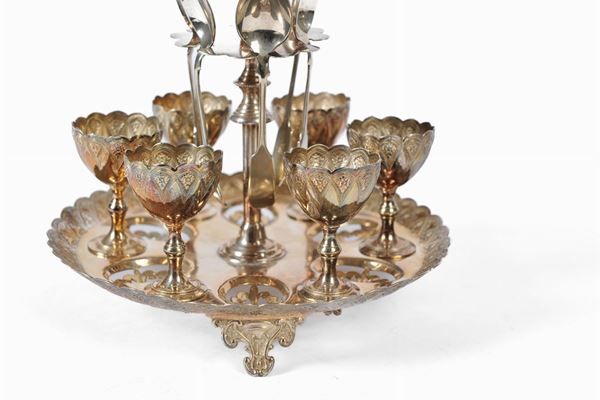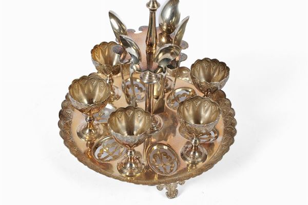 in metallo argentato, a 6 piazze con cucchiaino, in metallo sbalzato e inciso. Mancante cucchiaino.
