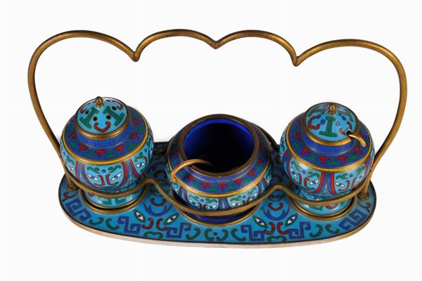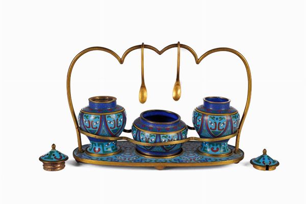 Con zuccheriera, entro struttura portante, in bronzo smaltato a fondo blu, con motivi geometrici in rosso, blu e verde come finitura.