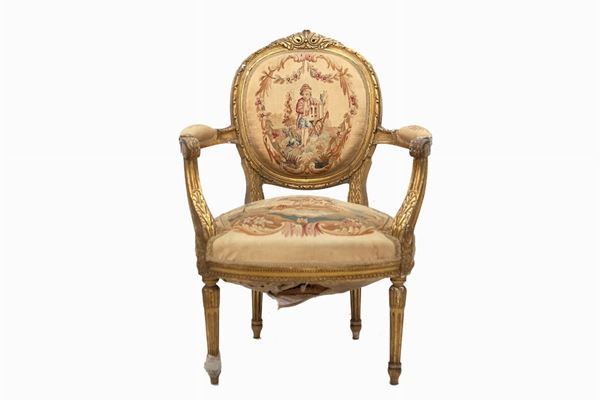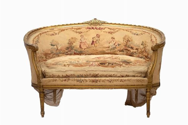 composto da 1 divano a pozzetto e coppia di poltroncine, in legno scolpito e dorato. Tappezzeria piccolo punto con scene pastorali e ghirlande floreali. Restauri e mancanze.