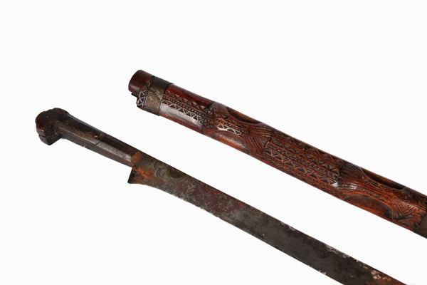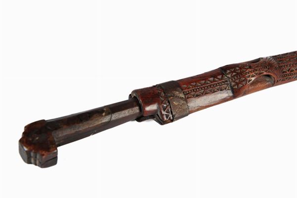 in ferro con impugnatura in legno, fodero in legno scolpito con puntale in metallo.