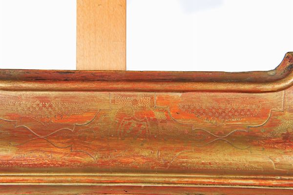 in legno dorato, con decoro a puntinatura, con elementi geometrici. Doratura molto usurata.