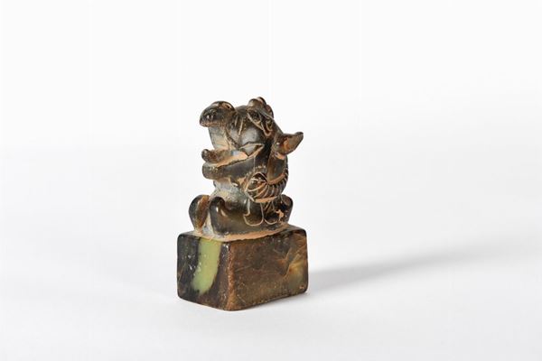 Scultura in volume, a forma di testa di animale fantastico, in giadeite marrone.